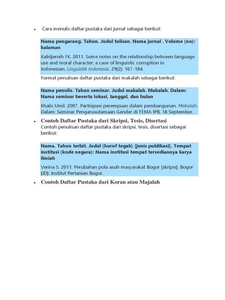 Ketika menulis berupa artikel ilmiah tugas perkuliahan skripsi tesis disertasi atau tulisan lainnya kadang penulisnya sering mengutip tulisan gagasan ide atau hasil karya orang lain untuk menunjang argumentasi tulisannya. Contoh daftar pustaka dari skripsitesisdisertasi penulisan daftar pustaka dari skripsi tidak jauh berbeda dengan penulisan daftar pustaka pada umumnya.